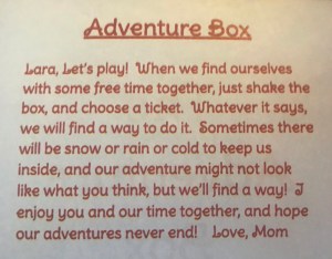 The Adventure Box started a few years ago. I didn’t have a lot of money for gifts that year, so I just thought about what is the best gift I could give my daughter. I decided it was my time, and my presence. Within this box are little ideas of things to go and do, or stay home and do, together, described here in this picture.